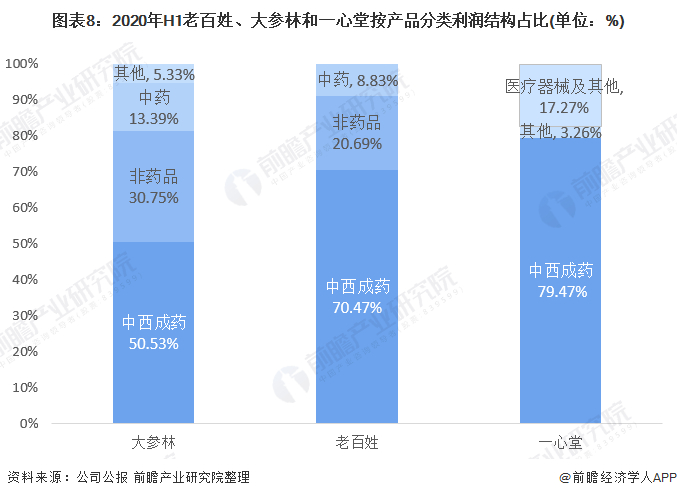 从利润结构上来看,大参林、老百姓药店和一心堂的主要利润来源都是中西成药。大参林利润来源较其他两家公司更为分散,大参林50.53%的利润来自中西成药,非药品产品利润占总利润的30.75%,中药占13.39%。