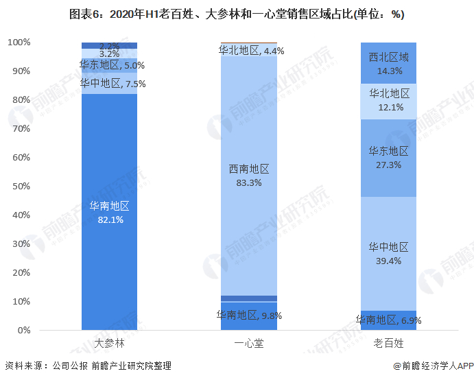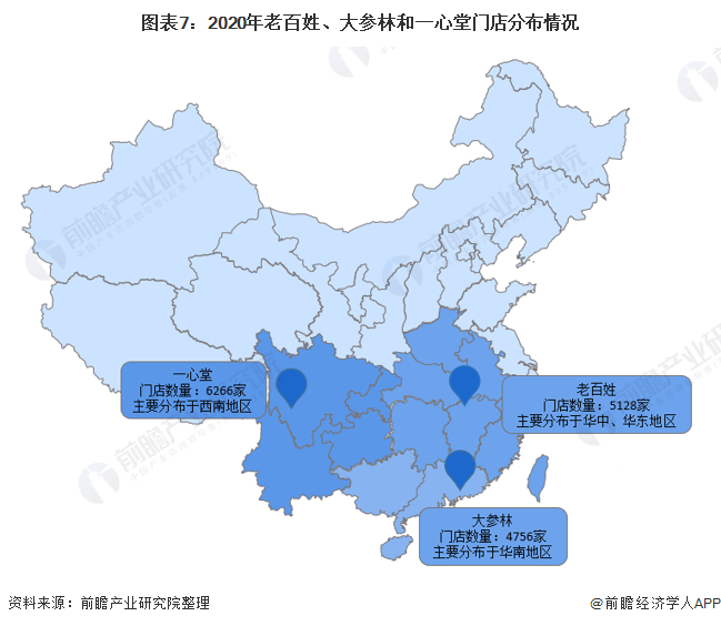 一心堂总共有6266家门店,主要分布于西南地区;老百姓总共有5128家门店,主要分布于华东、华中地区;大参林总共有4756家门店,主要分布于华南地区。