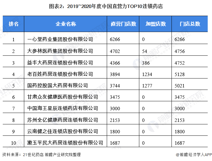 根据21世纪药店发布的《2019~2020年度中国连锁药店直营力力百强企业》排名,一心堂药业集团股份有限公司、大参林医药集团股份有限公司和益丰大药房连锁股份有限公司排名前三,依次分别有6266、4702和4366家直营门店。