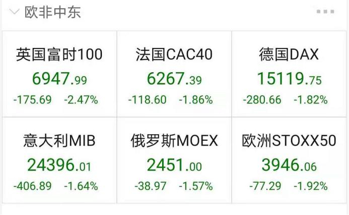 欧洲股市跌幅更为明显,英国富时100跌2.47%,法国CAC 40跌1.86%,德国DAX跌1.82%。