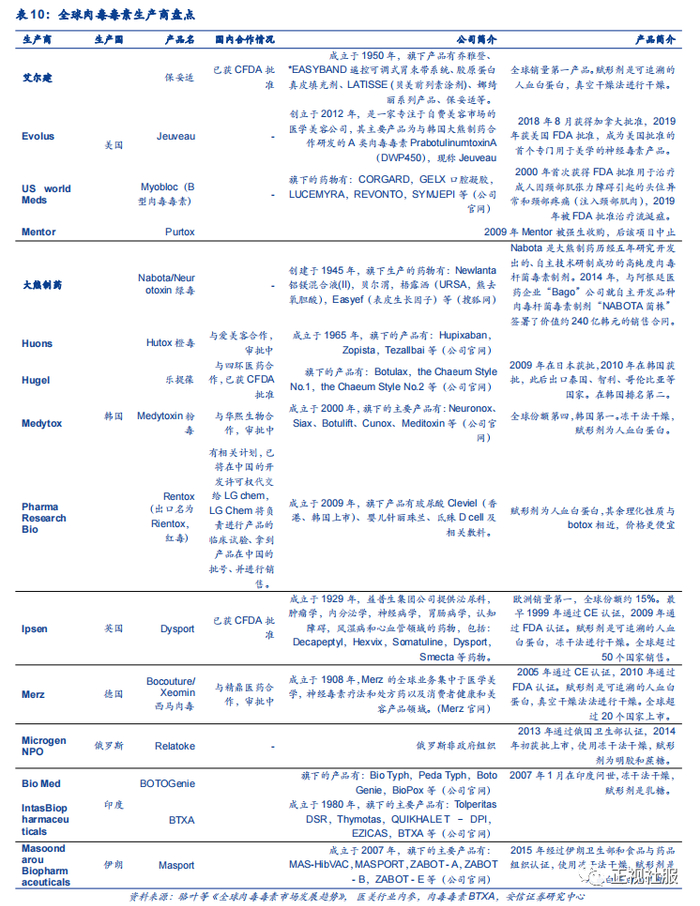 放眼全球,肉毒生产商蓬勃涌现。根据新浪医药,目前保妥适是全球市场份额最高的产品,全球份额曾经高达86%,现在仍有65%以上;此外,全球市场份额较高的还有英国的Dysport(英国Ipsen生产, 欧洲称Azzalure,德国的Xeomin(欧洲称Bocouture),和韩国的Neuronox(Medytox生产,其他地区称Meditoxin、Cunox、Botulift等)。