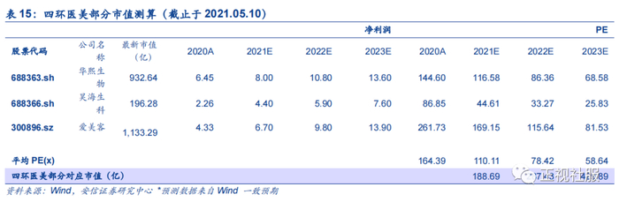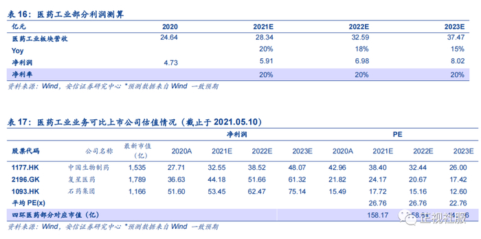 乐提葆2021 年起投放市场,由于港股市场暂无可比医美上游产品公司,选取A 股相关公司为可比公司,考虑到四环为经销代理商且A股与港股估值体系不同,估值给予0.6倍折价。参考可比上市公司估值情况,给予2021年66.07倍估值,医美业务对应188.69亿元。