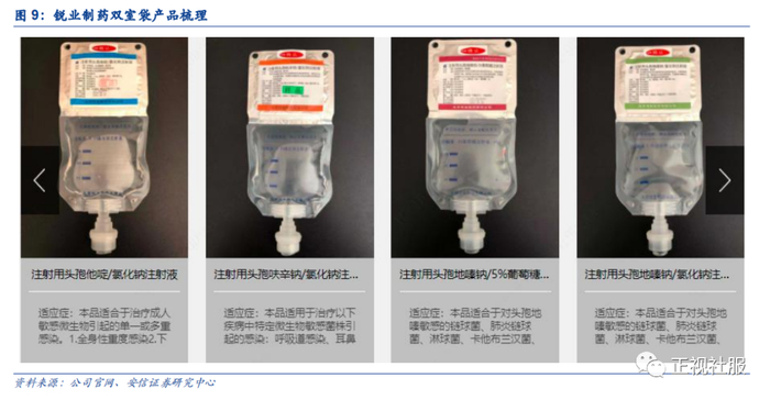 公司拥有注射用头孢他啶/氯化钠注射液、注射用头孢地嗪钠/葡萄糖注射液、注射用头孢地嗪钠/氯化钠注射液、注射用头孢呋辛钠-氯化钠注射液4个国内独家粉液双室袋产品。目前国内非PVC软袋输液产品的使用率较低(仅为20%),且双室袋产品具备避免输液污染、配液方便、不存在误配药风险等优势,看好其销售快速放量。