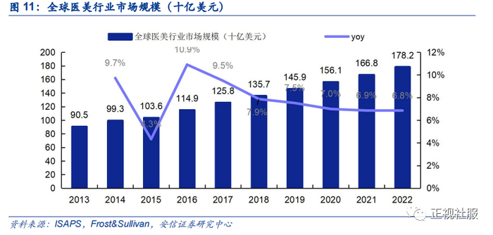 全球规模稳定增长,2018年达1357亿美元。根据国际美容整形外科学会和弗若斯特沙利文的报告,2018年全球医疗美容服务市场总收入达到1357亿美元,同比增幅7.9%。未来预计保持8%左右的增速,2022年市场规模将达到1782亿美元。
