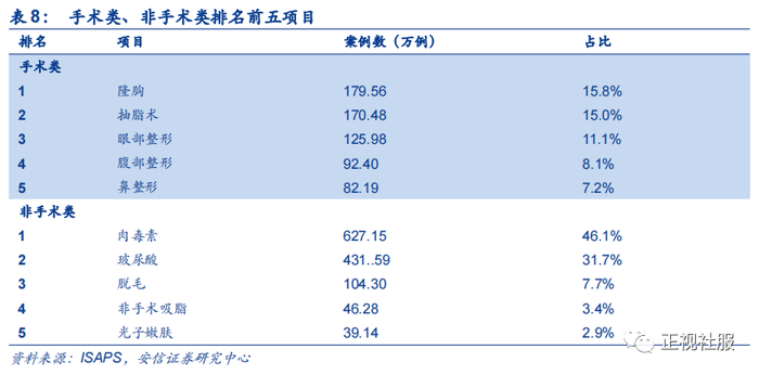 分项目看,全球非手术类项目案例数占比最大的为肉毒素,19年占比46.1%达627万例,玻尿酸排名第二,占比31.7%达432万例。