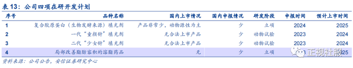 根据公司公告,目前集团已经开始其他医疗美容产品的临床试验,预计在不久的将来进一步实现产品多元化。公司在研10余款医美产品包括:1.胶原蛋白类产品;2.可吸收聚酯类产品:一代“童颜针”填充剂、二代“少女针”填充剂;3.局部改善脂肪容积的溶脂药品。