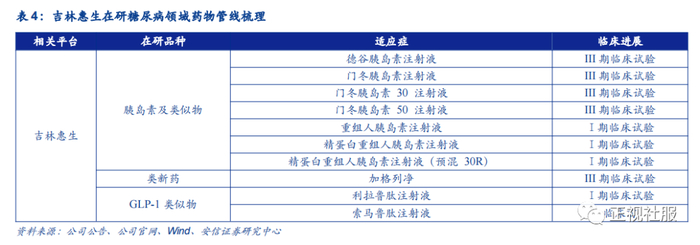 四环医药进一步推进糖尿病产品布局和项目研发。四环医药子公司吉林惠升生物研发管线覆盖口服降糖药、二代三代四代胰岛素、GLP-1类似物等。其中,核心产品1.1类新药 SGLT2 抑制剂(加格列净)针对降糖降压、心肾保护,目前已进入III期临床试验;德谷胰岛素已进入III期临床试验,临床应用效果显著超越同类型基础胰岛素。