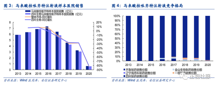 马来酸桂哌齐特注射液主要用于治疗脑血管疾病,根据Wind医药库数据,2020年样本医院销售为6267.88万元,同比下降81.03%,四环制药、一格制药的销售市占率分别为97.71%、1.04%。其中,2020年四环制药的马来酸桂哌齐特注射液实现样本医院销售6124.55万元,同比下降80.07%。目前,马来酸桂哌齐特注射液的新适应症(治疗急性缺血性脑卒中)已获批临床,未来有望凭借新适应症实现产品销售的大幅回升。