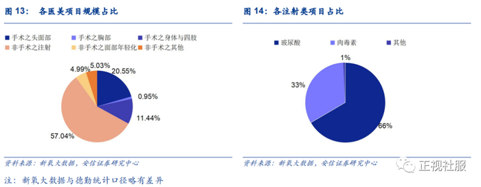 注射类项目市场规模约占行业总体近六成,其中玻尿酸最受欢迎。据新氧大数据预测,注射类医美项目市场规模行业占比最大,2019年约57.04%。其中,玻尿酸注射占比66%,肉毒素注射占比33%。