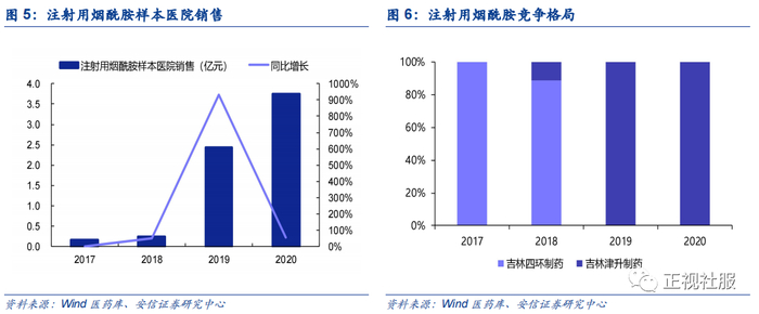 注射用烟酰胺主要用于防治烟酸缺乏的糙皮病、冠心病、病毒性心肌炎等伴发的心律失常。根据Wind医药库数据,该品种2020年实现样本医院销售3.76亿元,同比增长54.69%,公司的全资子公司津升制药占据100%市场份额。
