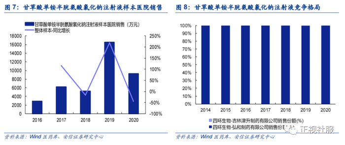 甘草酸单铵半胱氨酸氯化钠注射液具有抗肝中毒、降低谷丙转氨酶、恢复肝细胞功能的功效,主要用于慢性迁延必肝炎、慢性活动必肝炎、急性肝炎、肝中毒、初期肝硬化等治疗。根据Wind医药库数据,2019年甘草酸单铵半胱氨酸氯化钠注射液样本医院销售1.65亿元,同比增长218.47%,主要得益于进入医保后产品快速放量。2020年样本医院销售同比下降主要是疫情影响所致,看好2021年其销售恢复性增长。
