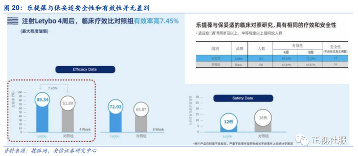 三期临床结果表明,乐提葆与保妥适安全性和有效性并无差别。临床结果表明,注射乐提葆4周后,临床疗效比对照组高 7.45%,而8周后乐提葆有效率为72.03%。安全性方面,两个产品在轻度不良反应,严重不良事件及药物相关不良事件上无统计学差异。