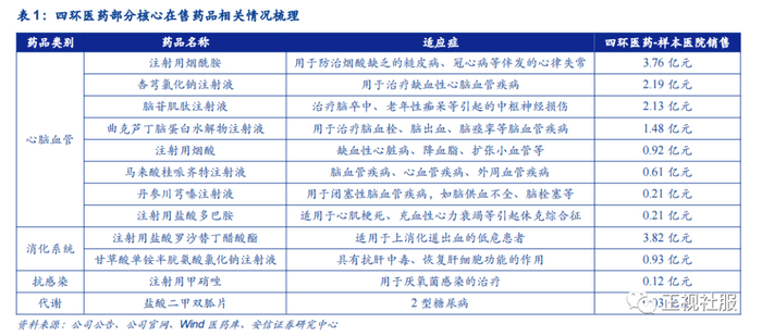 四环医药在售药品充分覆盖心脑血管、消化系统、抗感染、代谢等多个领域。在售核心产品包括马来酸桂哌齐特注射液(克林澳)、注射用烟酰胺(普扶林)、注射用盐酸罗沙替丁醋酸酯(杰澳)、甘草酸单铵半胱氨酸氯化钠注射液(回能)、粉液双室袋产品等。