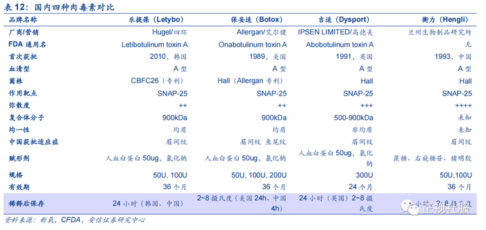 目前CFDA仅批准四种注射用A型肉毒毒素,分别为国产的“衡力”、美国进口的“保妥适 BOTOX”、英国益普生公司生产的“吉适Dysport”以及韩国Hugel公司研发的“乐提葆 Letybo”。衡力由兰州生物制品研究所生产,1993年在中国获批用作新药,2012年才被批准用于整形美容,其在全国29个省份指定了77家经销商;保妥适由美国艾尔建公司生产,2009年被CFDA批准用于美容,国药控股分销中心有限公司是其总经销,目前在全国30个省份指定了56家二级经销商;丽舒妥/吉适由英国益普生公司生产,丽舒妥/吉适于2009年在美国上市,最初用于治疗成年颈椎张力障碍(CD)和痉挛患者,2020年被CFDA批准用于整形美容;韩国生物制药公司Hugel, Inc.生产的「注射用A型肉毒毒素(Letybo 100U,商品名:乐提葆)」与2020年成功取得CFDA上市批准,是首个及唯一一个获得国家药监局上市批准的韩国肉毒毒素产品,在中国境内由四环医药独家代理的。