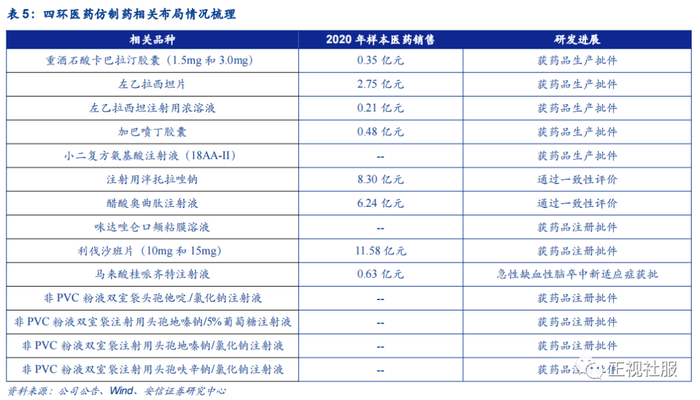 四环医药围绕精神神经、心脑血管、消化、抗感染等领域布局仿制药研发。公司的仿制药研发管线覆盖53个在研项目,近期重酒石酸卡巴拉汀胶囊(1.5mg和3.0mg)、左乙拉西坦片、加巴喷丁胶囊、小二复方氨基酸注射液(18AA-II)、左乙拉西坦注射用浓溶液获得药品生产批件,仿制药的研发进展顺利。