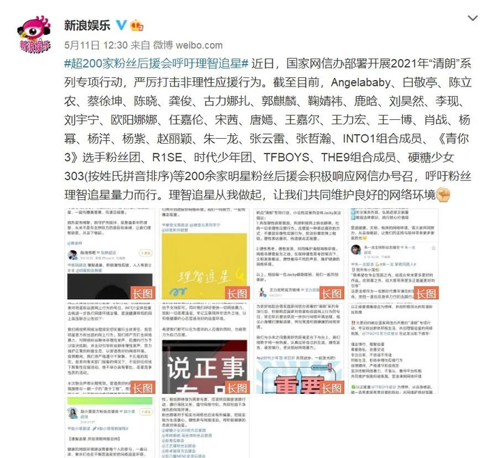 5月11日,蔡徐坤、王一博、肖战、INTO1组合成员、R1SE、时代少年团、TFBOYS等200余家粉丝后援会,哇唧唧哇、时代峻峰、嘉行传媒等多家经纪公司,以及肖战工作室、龚俊工作室等明星工作室,积极响应网信办号召,呼吁粉丝理智追星。