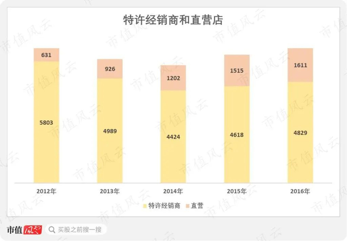 而且,为了提高运营效率,加强对渠道的管理能力,公司持续增加直营店数,从2012年的仅631家逐年增加至2016年的1611家,占比从9.81%提升至25.02%。