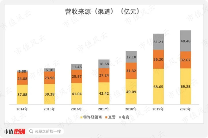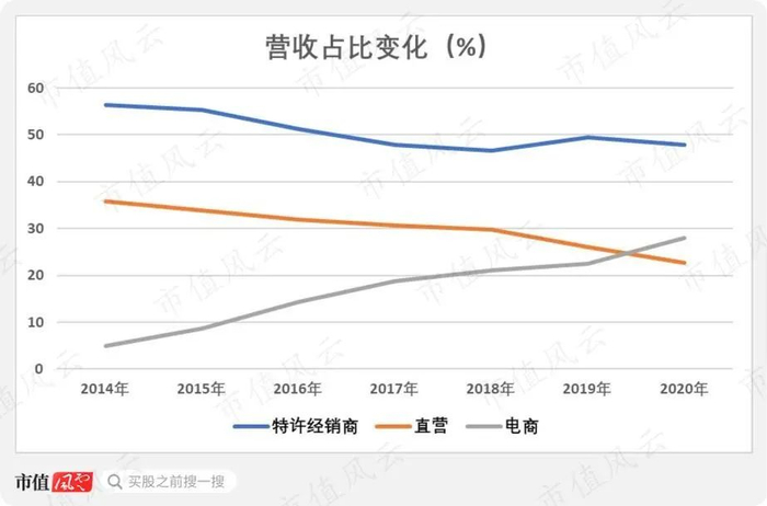 因此,电商的营收占比从2014年的4.9%上升至2020年的28%,反超直营店的22.6%。