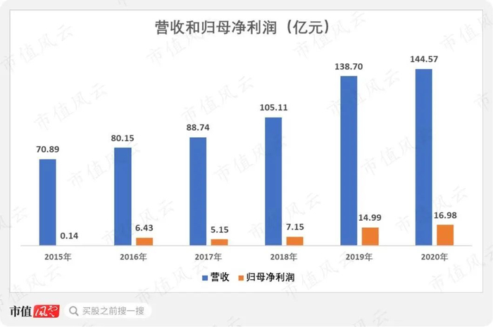 公司营业收入从2015年的70.89亿逐年增长至2020年的144.57亿,复合增速为15.32%。
