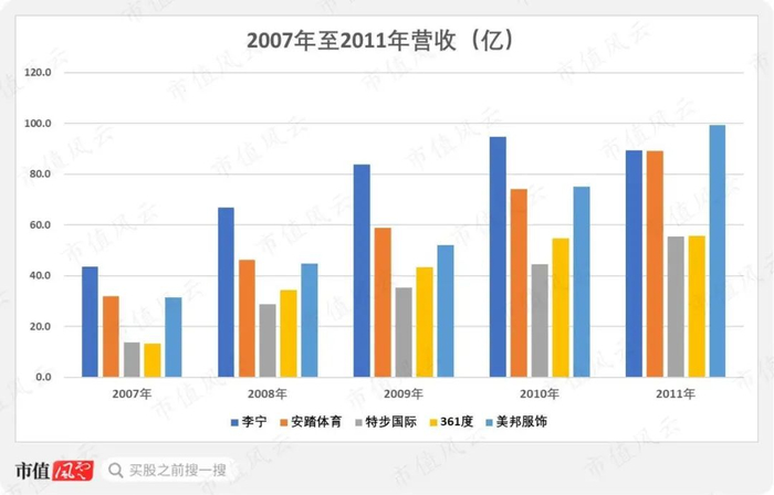 以李宁、安踏体育、森马服饰、美邦服饰等5家公司为例,李宁的营收从2007年的43.49亿上升至2010年的94.79亿,2011年回落至89.29亿,复合增速仍达19.7%,低于安踏体育的29.33%。