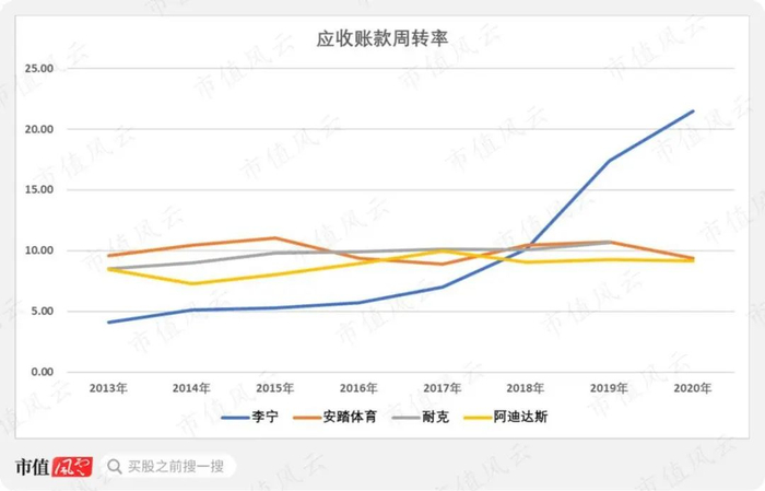 李宁的应收账款周转率从2013年的4.1次大幅上升至2020年的21.47次,远远高于其他3家公司。