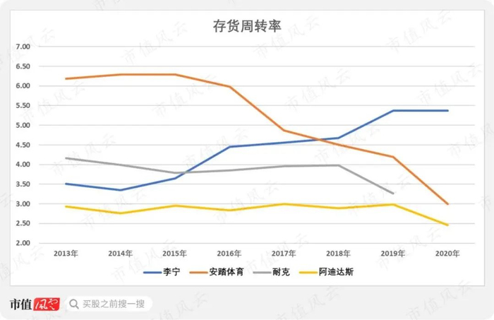 而李宁的存货周转率从2013年的3.51次上升至2020年的5.37次,同样远优于其他3家公司。