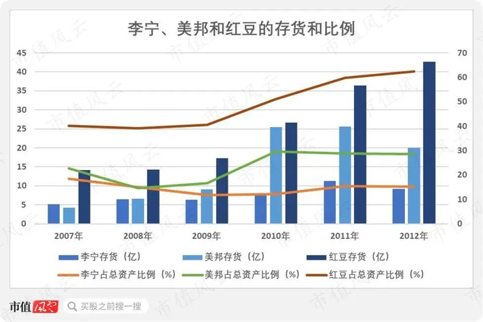 而李宁的情况反而相对比较好,2011年是存货规模高峰,为11.33亿,占比上升至15.46%。
