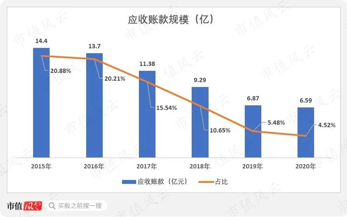 表现最为神奇的是李宁的应收账款,从2015年的14.4亿逐年下降至6.59亿,资产占比从20.88%下滑至仅4.52%。