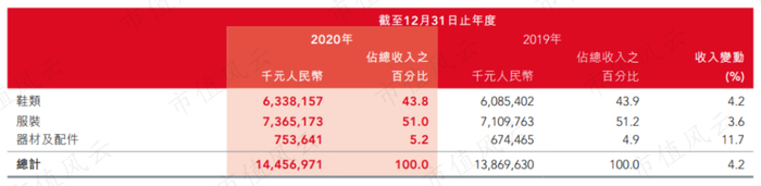 从产品分类看,在2019年和2020年,服装收入占总收入的比例约为51%,鞋类占比约为43%,是最主要的收入来源。