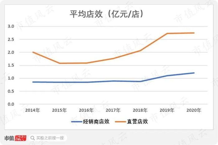 经销商店效表现比较平稳,近年来有上升苗头,2020年达1.21亿元/店。