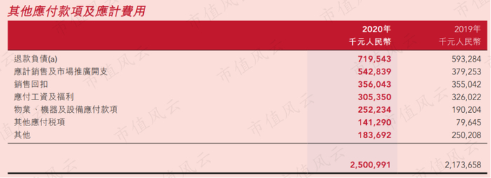 其他应付款项及应付费用主要包含了退款负债、应计销售及市场推广开支和销售回扣等,均为经营性负债。