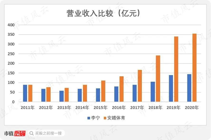 安踏体育在2012年才出现下跌,但下跌幅度不高,并且营收首次反超李宁,2014年后恢复增长并且快速甩开李宁。