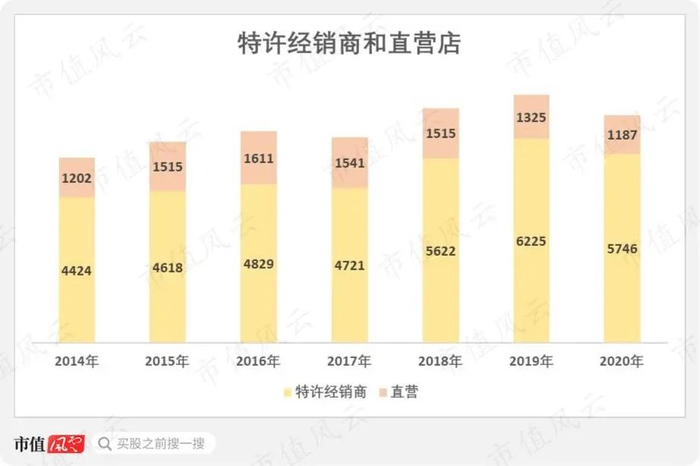 再看线下渠道,经销商店数从2014年的4424家缓慢回升至2019年的6225家,而直营店数在2016年达到巅峰的1611家后反而回落至2020年的1187家。