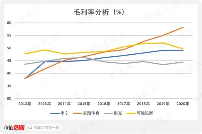而安踏的表现最为夸张,自2018年毛利率突破50%后,2020年已经上升至58.15%,遥遥领先于可比公司。