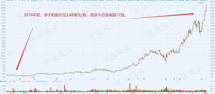 李宁的股价从2016年初开始上涨,从约3.88元港币/股(前复权)飙升至如今的超70元港币/股,涨幅多达17倍,市值攀升至1700多亿。