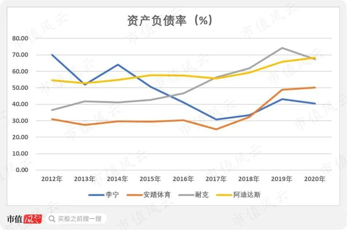 其他3家公司近年来同样出现资产负债率升高的趋势,耐克和阿迪达斯在2020年达到将近70%的较高水平,安踏体育从2017年的24.71%快速上升至2020年的50.21%。