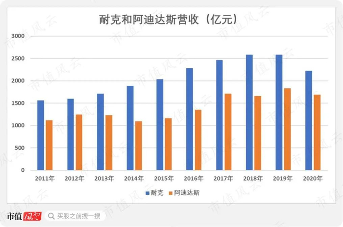 而耐克和阿迪达斯早在2011年就是千亿营收规模的企业,耐克在2015年突破2000亿营收,2019年上升至2583.85亿,2011-2019年8年复合增速为6.51%。