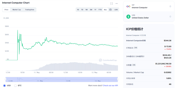 截至本文发稿,据Coinmarketcap数据,ICP报344.63美元,总市值超420亿美元,加密货币市场占有率1.69%。