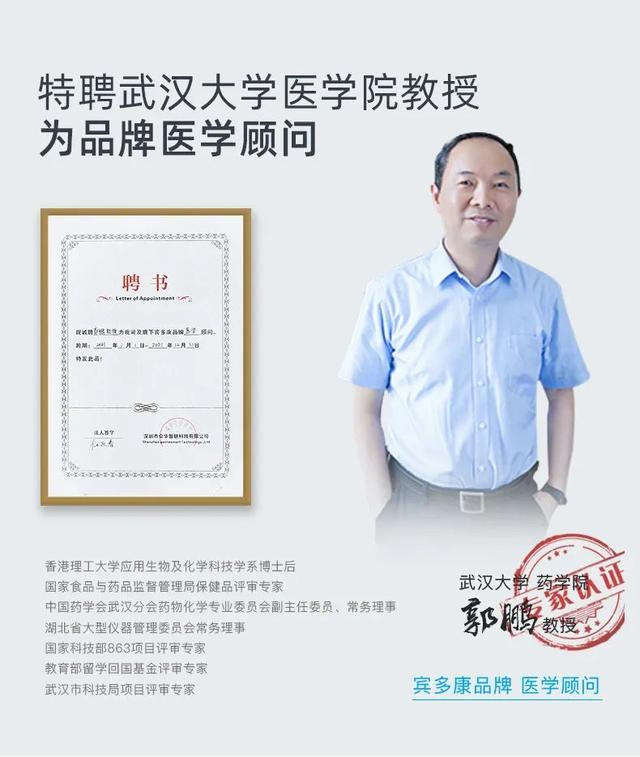 除此之外,宾多康也与武汉大学健康学院达成研究合作项目,特聘医学院教授为品牌的医学顾问。
