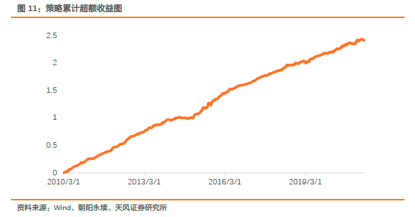 最后,我们选取c=0.5和ρ=0.5作为组合策略的最终参数。在该参数设定下,我们从2010年3月至2021年5月初回测策略,策略平均年单边换手6倍,费前年化日单利超额收益率为21.6%,费前年化日单利信息比为4.6。需要指出的是此处策略的杠杆率为95%。下图是策略的费前日单利收益累计图,从图中可以看出,自2017年以来策略的超额收益略有走平,这与高频量价策略走弱有关: