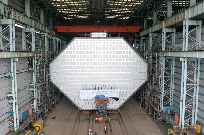 这个宽、高均为32米左右的菱形B型液货舱是目前全球最大的独立液罐,采用了江南造船首创的“BrilliancE®”货物围护系统,它的建成标志着江南造船在VLEC建造上取得了关键技术突破,提升了中国造船业在该领域的竞争力。