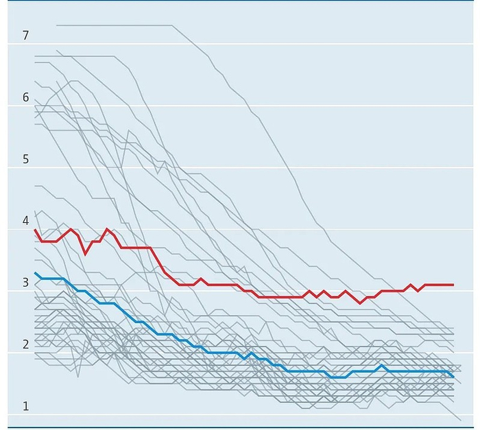 1960至2019年以色列与OECD总和生育率比较。红线为以色列,蓝线为OECD平均总和生育率