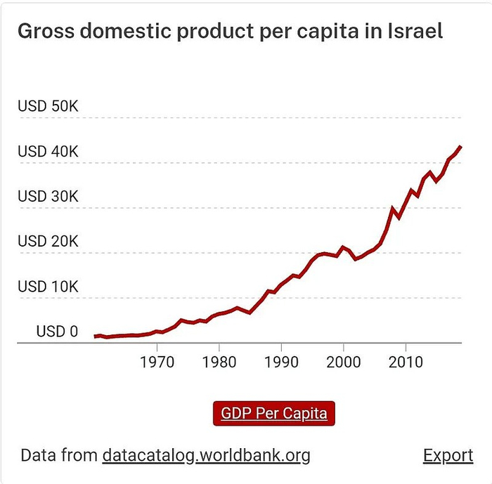 当然,人口的大量增长,并没有拖累以色列的人均GDP。