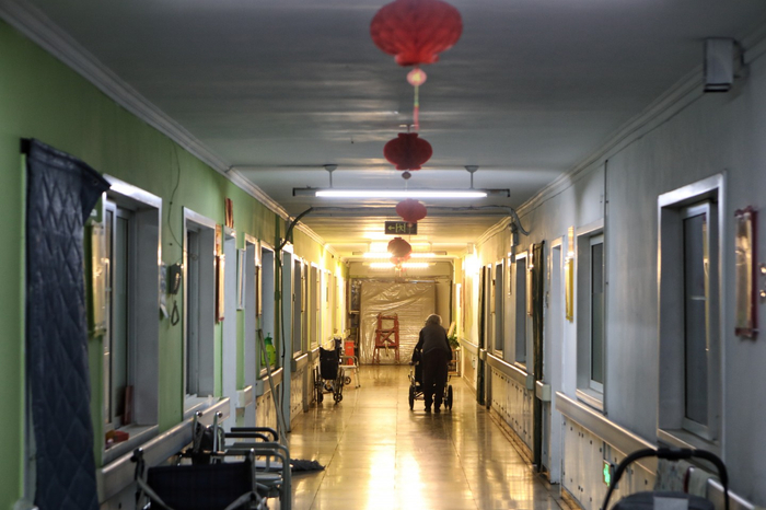 2021年3月21日,北京松堂关怀医院,一位老人在病房外通道散步。专为儿童临终关怀设置的病房雏菊之家,位于通道的末端。新京报记者 王嘉宁 摄