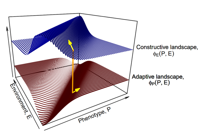 他们以两个关联的地形共同描述适应性演化,而不是仅用单一的适应性曲面:有机体通过在适应性(adaptive)景观上攀登而演化,同时环境的演化是通过在构建性(constructive)景观上攀登而发生的。两者之间的关系决定了特定生物的成功程度。