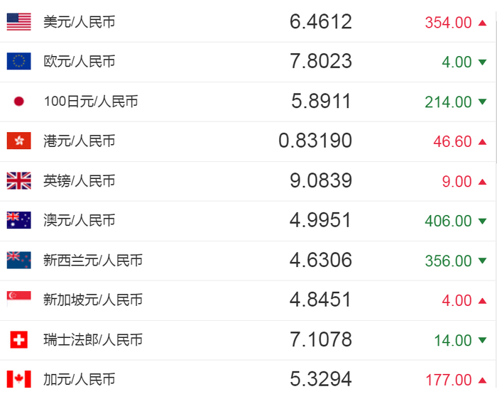 中国人民银行授权中国外汇交易中心公布,2021年5月13日银行间外汇市场人民币汇率中间价为:1美元对人民币6.4612元,1欧元对人民币7.8023元,100日元对人民币5.8911元,1港元对人民币0.83190元,1英镑对人民币9.0839元,1澳大利亚元对人民币4.9951元,1新西兰元对人民币4.6306元,1新加坡元对人民币4.8451元,1瑞士法郎对人民币7.1078元,1加拿大元对人民币5.3294元。