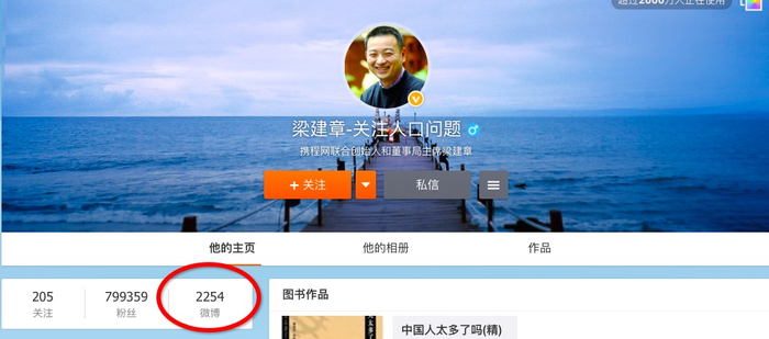 但梁建章在人口话题上的研究和发声却并没有因此而止步。在百度上,用“梁建章+人口”作为关键词进行搜索,能找到高达502万条结果。梁建章甚至在微博上专门开通了一个名为“梁建章-关注人口问题”的微博,梁建章现在在微博上有两个账号,一个讨论人口,一个服务携程。但人口专家梁建章发布了超过2200多条相关微博;而携程梁建章只有200多条。