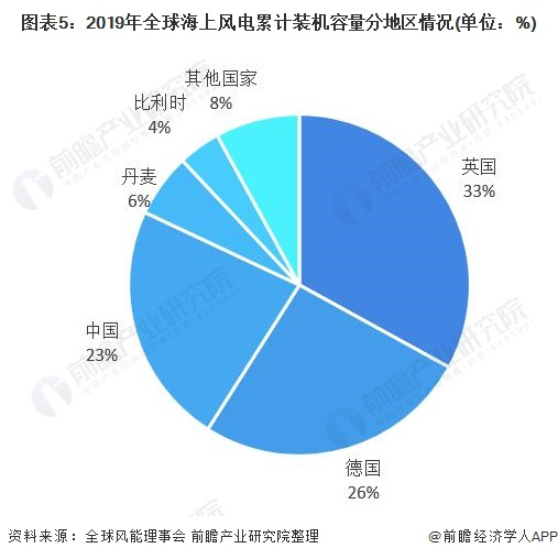 截止2019年底,欧洲继续保持全球最大海上风电市场地位,全球近69%的海上风电设施位于11个欧洲国家的近海水域。其中,英国是目前全球最大的海上风电市场国,累计装机容量9723MW,占全球装机容量的33%;