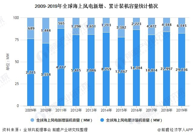 近几年,全球海上风力发电新增装机容量呈现波动上涨趋势,2019年,新增海上风电装机6.1GW,占全球新增装机的10%。2019年,全球海上风电累计装机容量接近29.1GW,较上年同比增长23%。