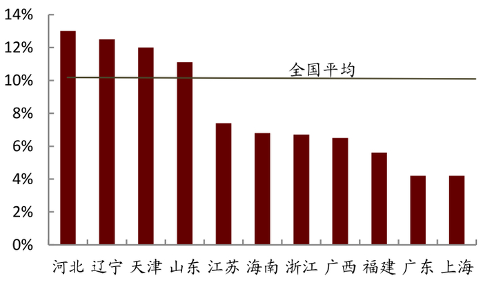 沿海省份是中国电力消费重心,但非水可再生能源消纳占比普遍较低。2019年中国沿海11省(直辖市)用电量合计占全中国用电量比例高达52%,但非水电可再生能源电力消纳占比层面,仅有河北、辽宁、天津和山东四省高于全国平均,其余沿海各省均低于8%。在非水可再生能源消纳占比的考核下,由于陆地风光受制于土地资源等因素,我们认为这些省份更倾向于通过自身新能源项目的建设,如海上风电项目来提升可再生能源占比。
